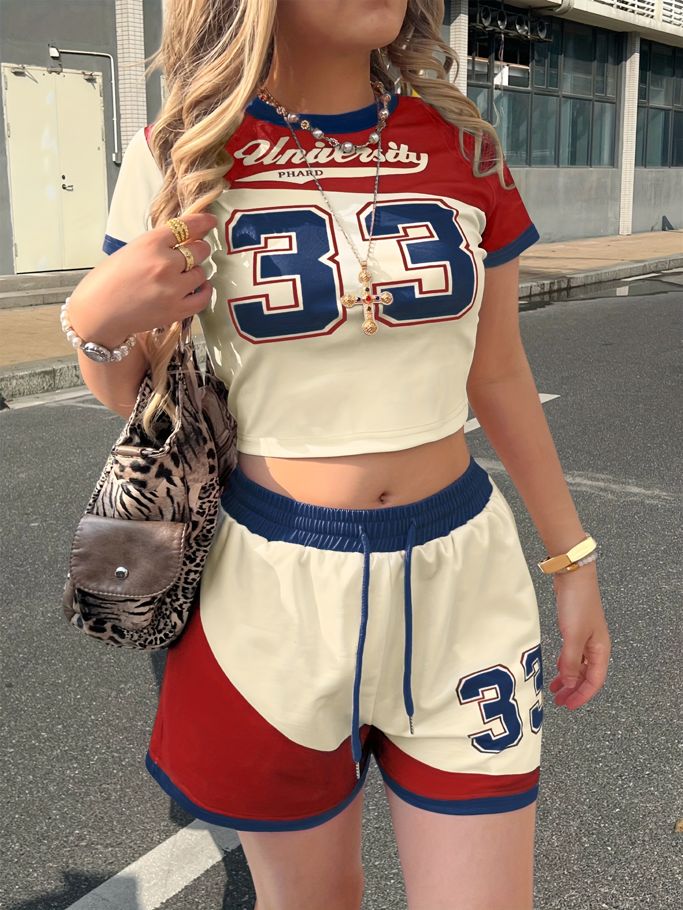 2pcs Campus Style s Set, Women'S Short Sleeve + Shorts, Red and Blue Contrast Number Print No. 33, Summer Casual Outfit