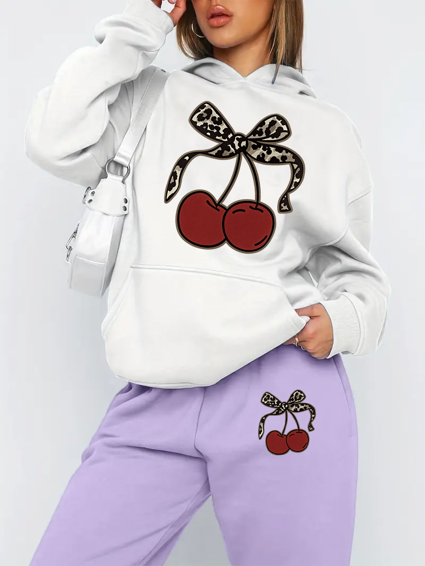 [Playful Design|Cherry Themed] Playful Design|Cherry Themed Hoodie and Pants Set - Casual Long Sleeve Pullover with Pockets, Fall/Winter Collection, Women's Fashion