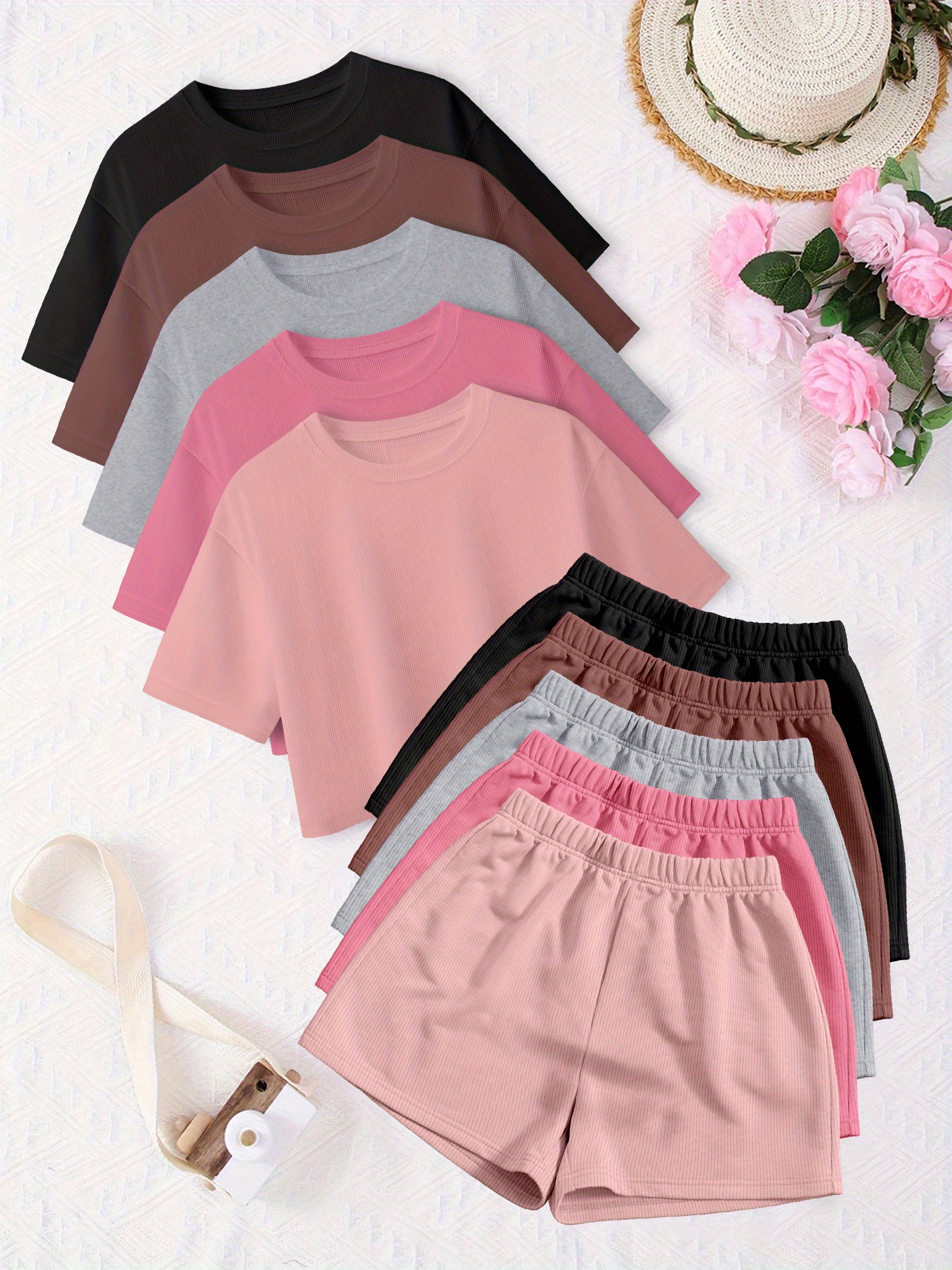 10pcs Women'S Spring Summer Casual Top and Pants Set Round Neck Short Sleeve T-Shirt + Comfortable Home Shorts -D10+K8-10pcs