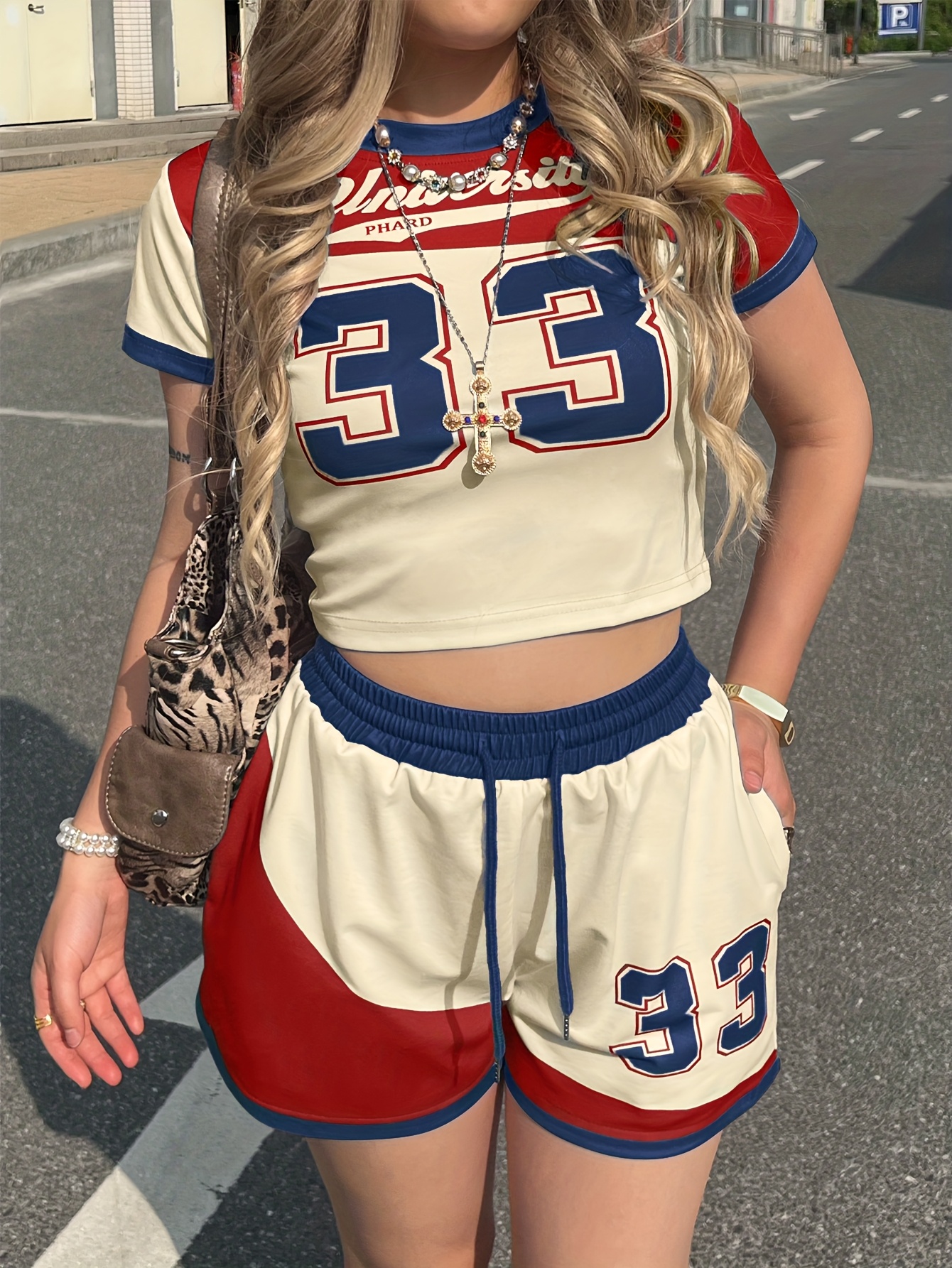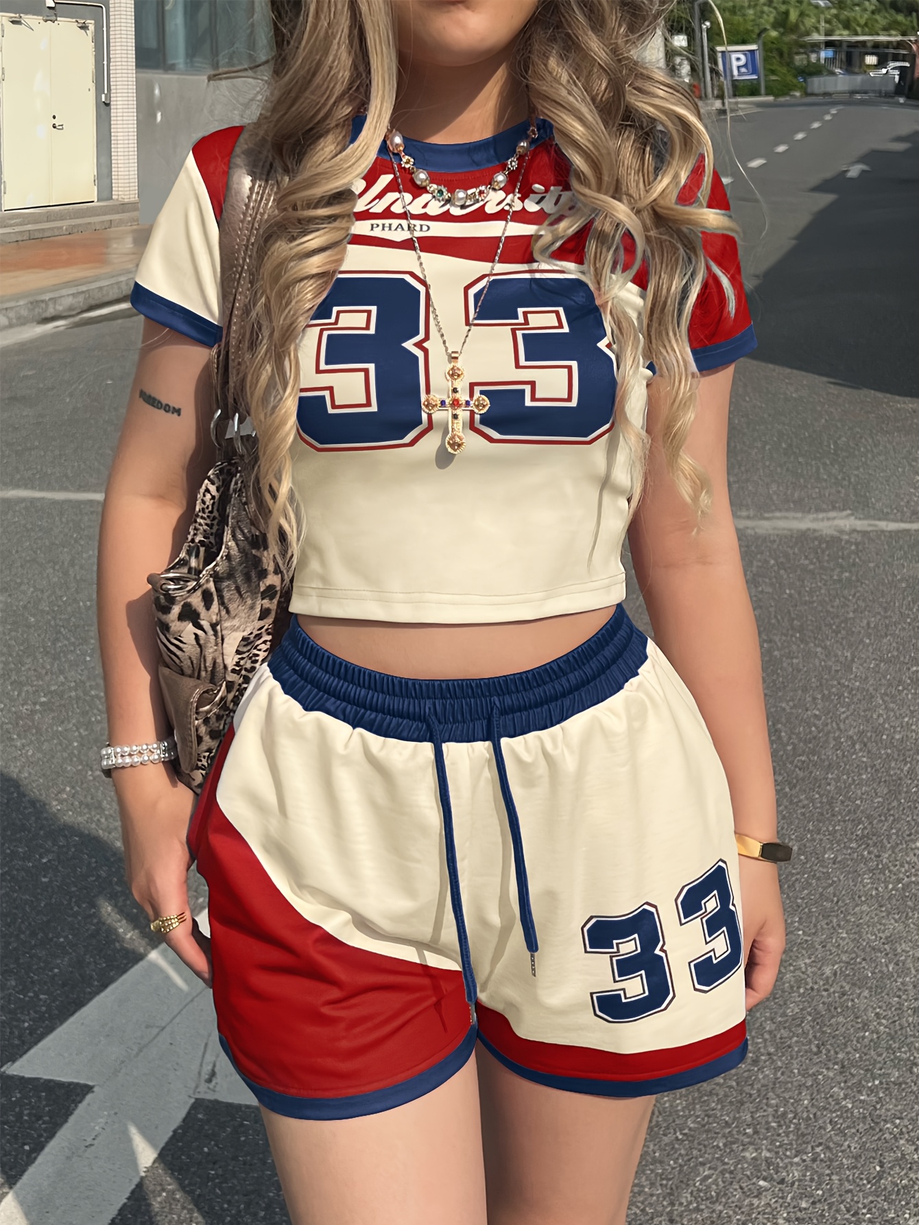 2pcs Campus Style s Set, Women'S Short Sleeve + Shorts, Red and Blue Contrast Number Print No. 33, Summer Casual Outfit