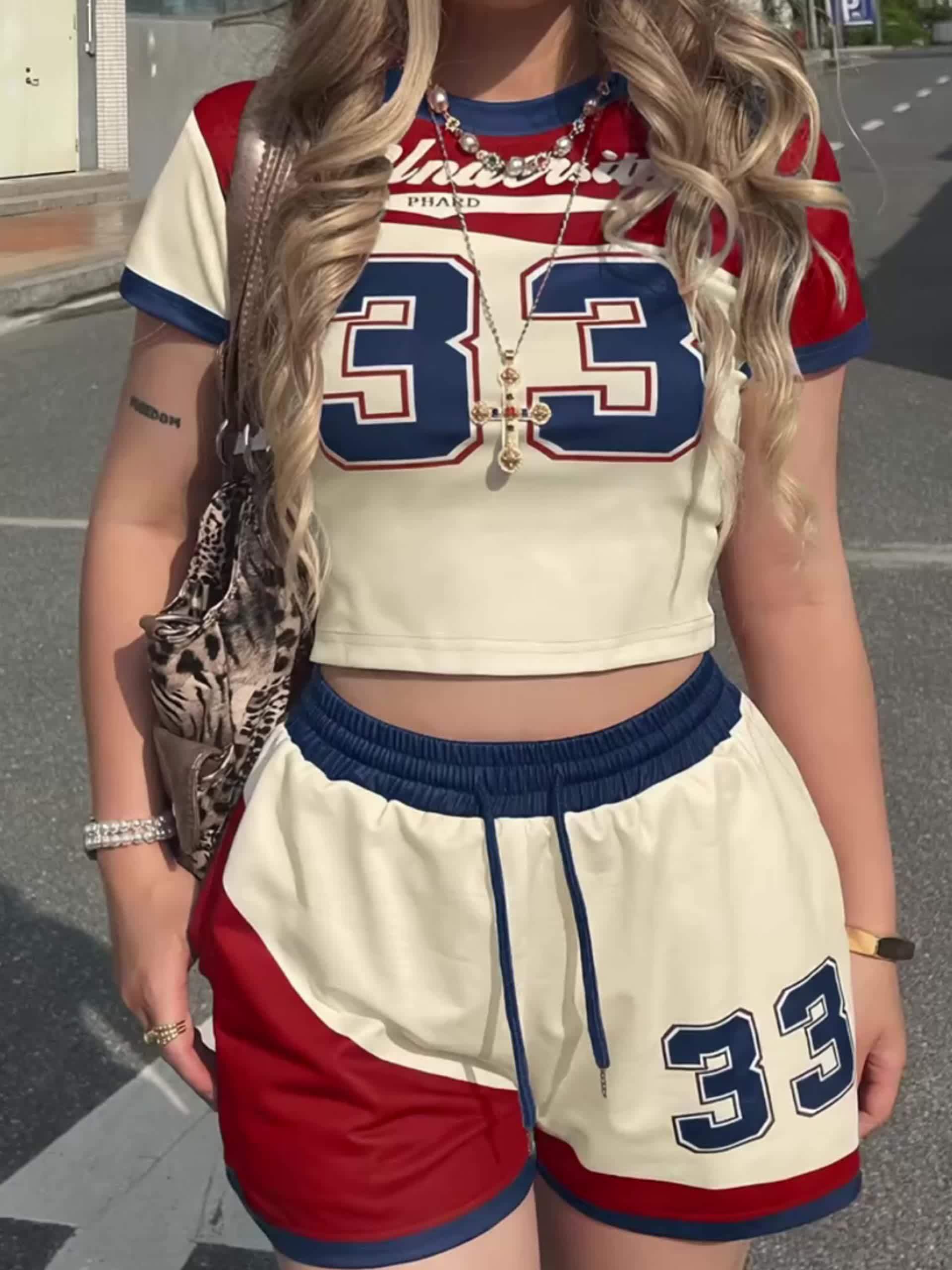 2pcs Campus Style s Set, Women'S Short Sleeve + Shorts, Red and Blue Contrast Number Print No. 33, Summer Casual Outfit