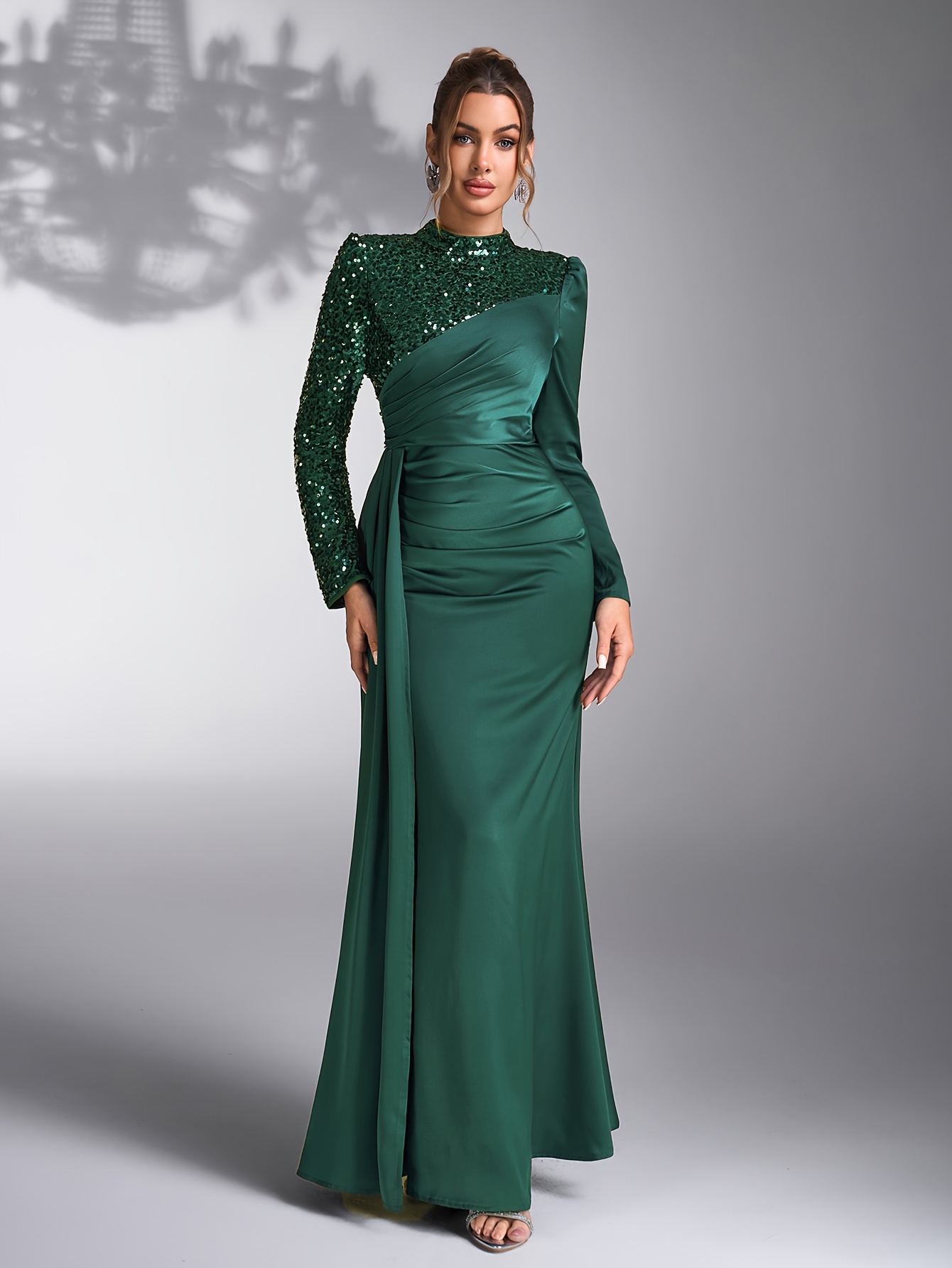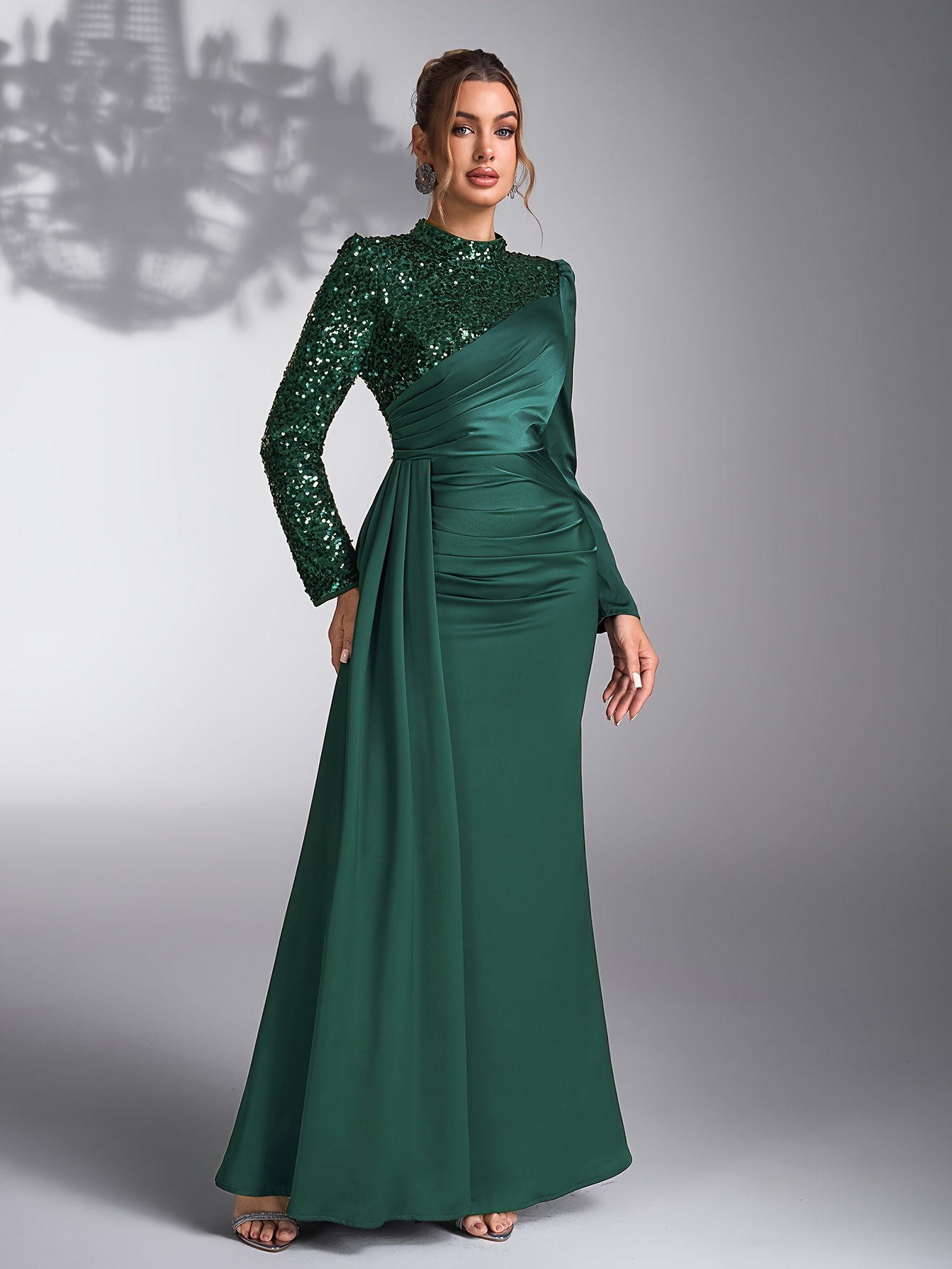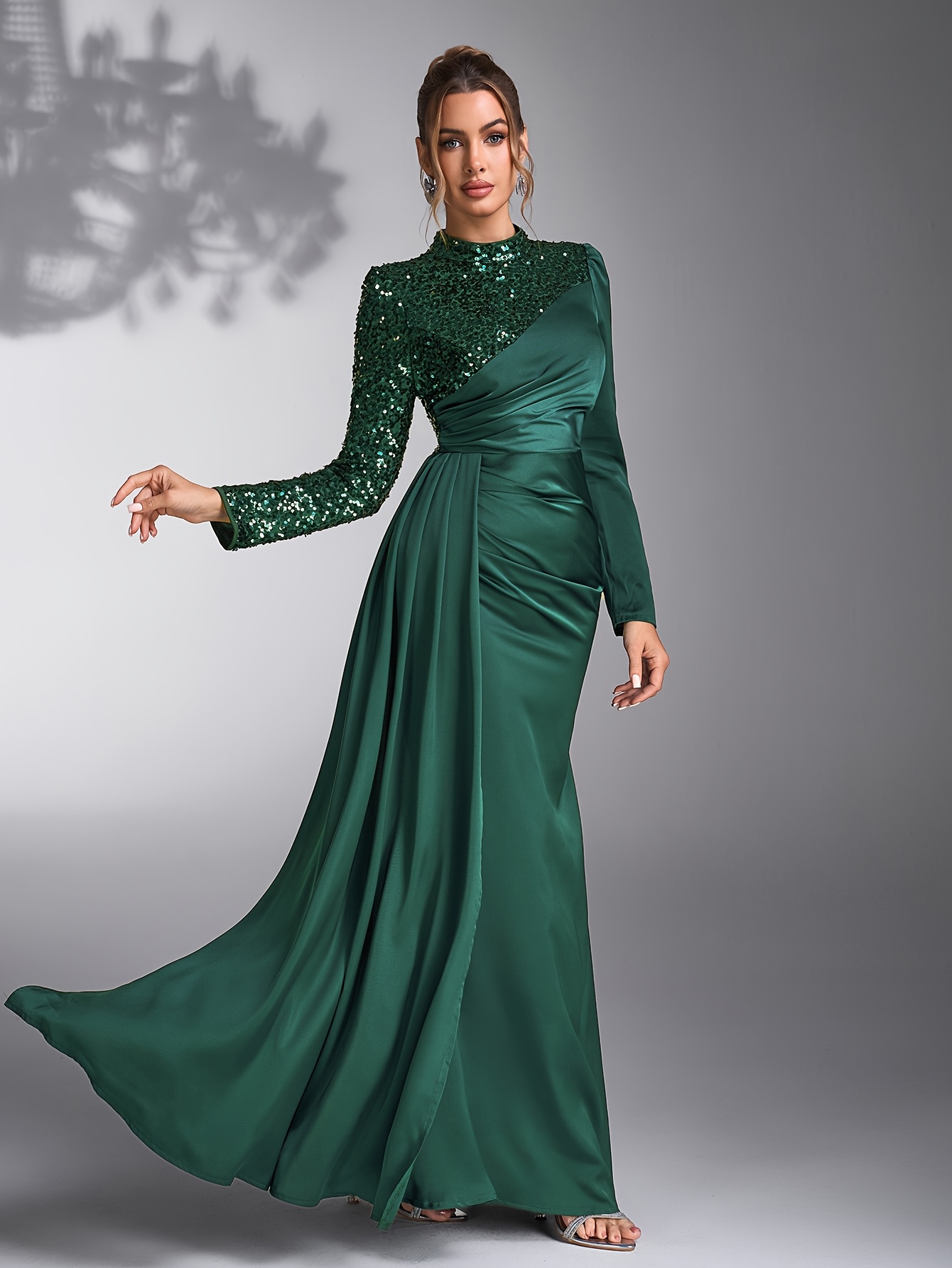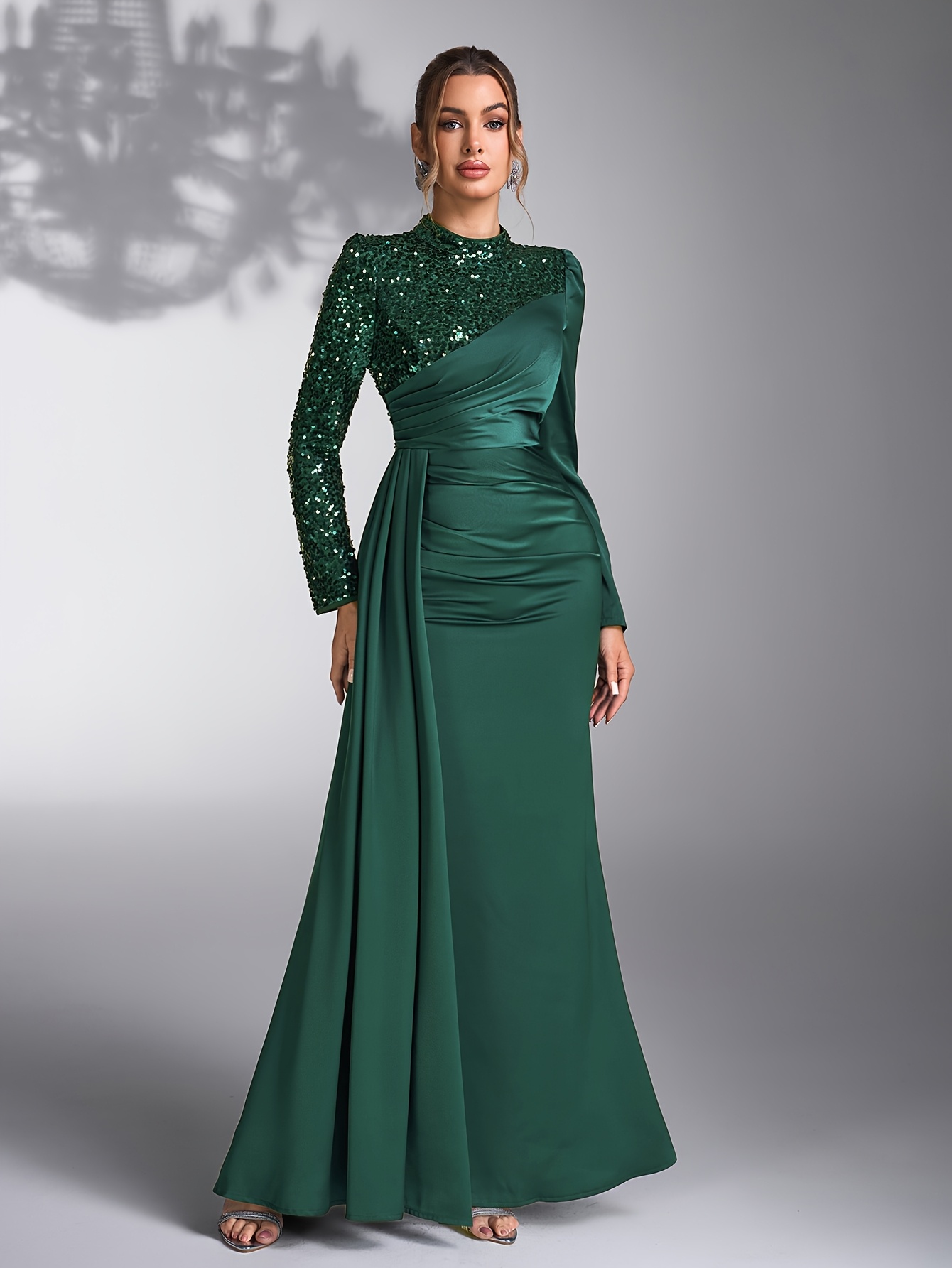 Emerald Green Sequin & Beaded Long Sleeve Bridesmaid Gown - Elegant Stand Collar Evening Dress for Weddings, Prom, Formal Events - All-Season Polyester Evening Dress for Women, Wedding Guest Attire | Sophisticated Bridesmaid Dress | Sequin Embellishments