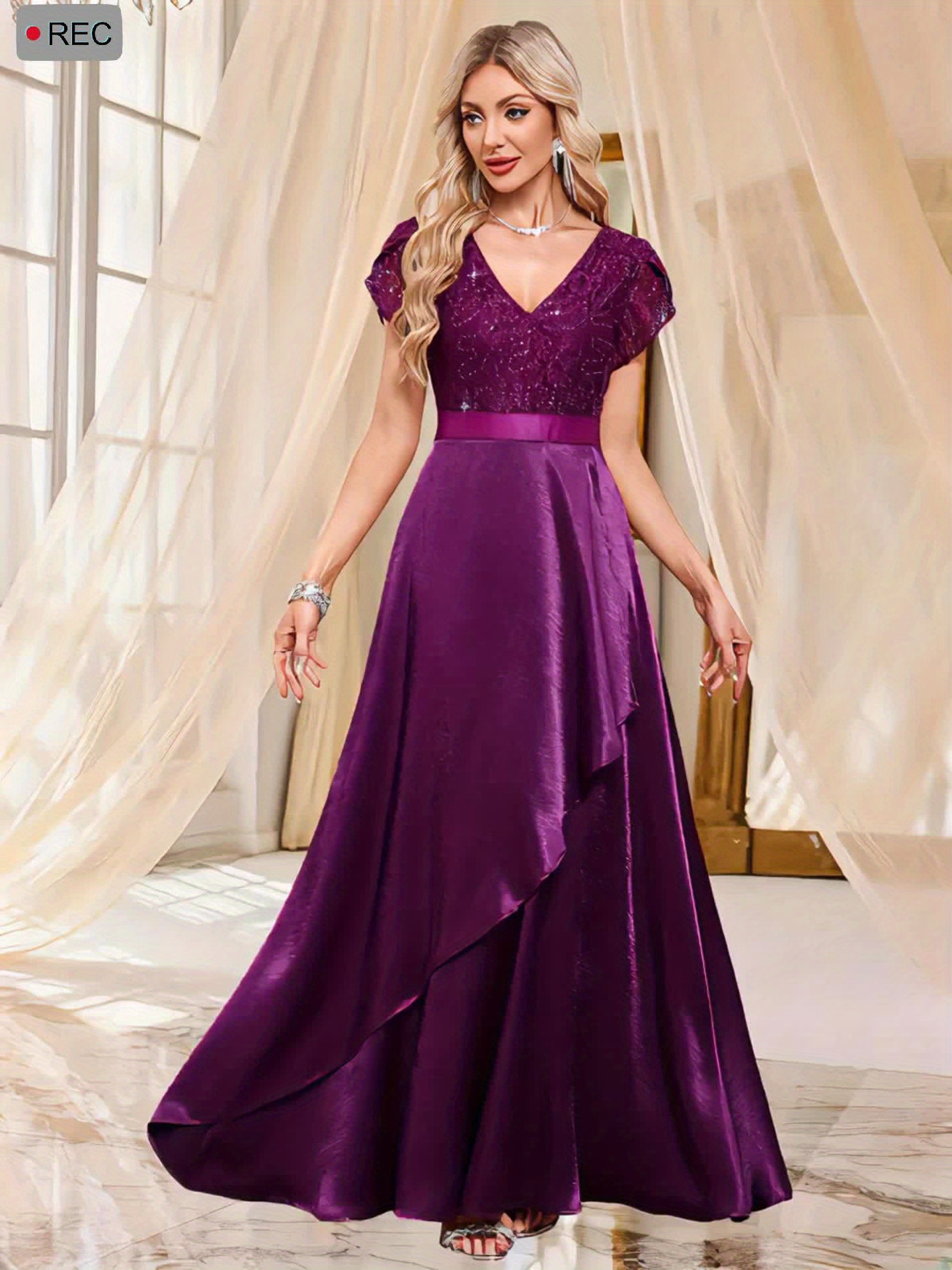 Elegant Purple Sequin Lace-Trimmed V-Neck Gown with Ruffle Sleeves and Flowing Skirt - Perfect for Formal Events, Formal Event Attire|Sequin Embellished Dress|Lace Trim Detail, Elegant Party Dress For Women, Elegant Dress For Women, Elegant Woman'S Dress