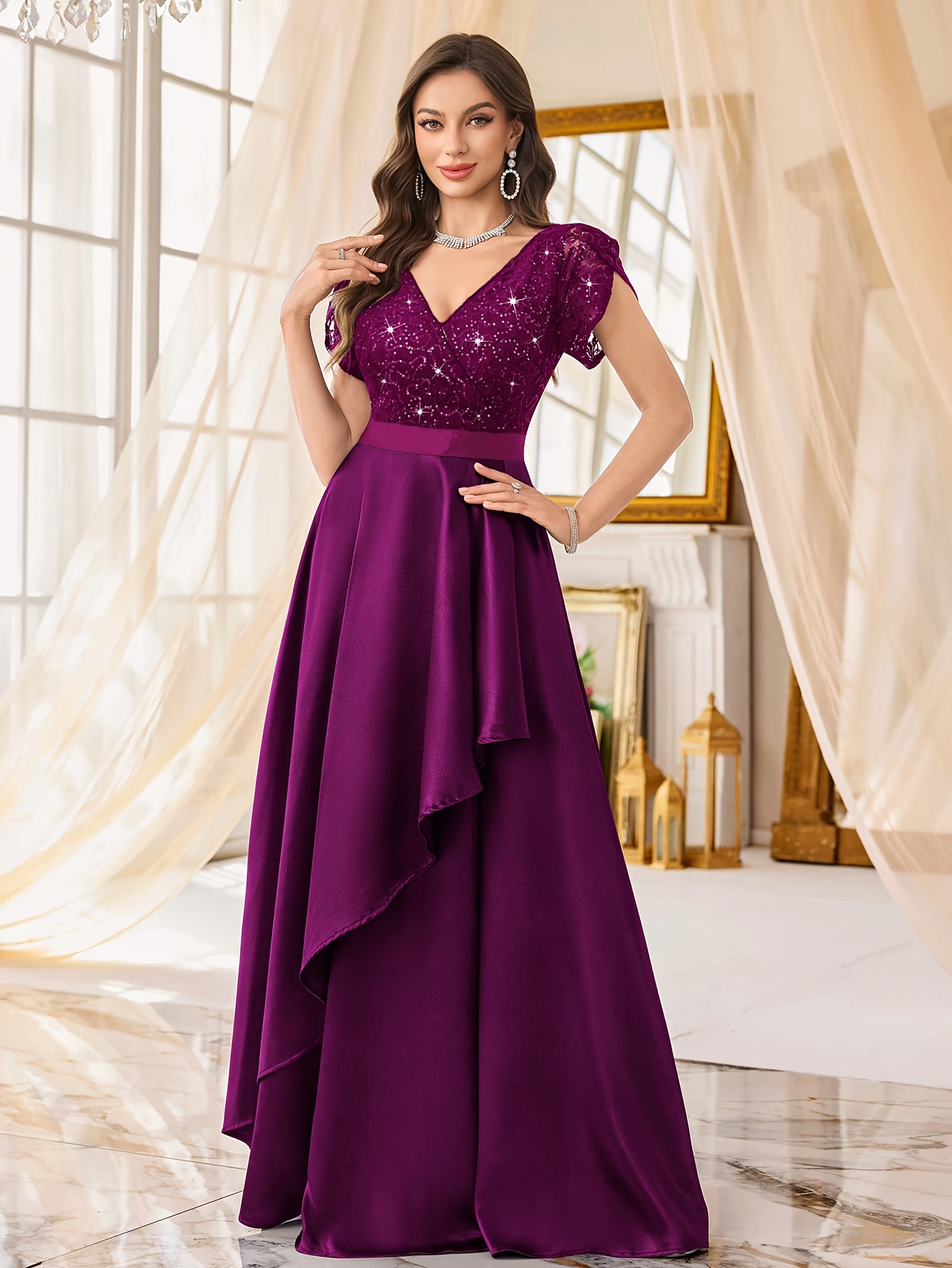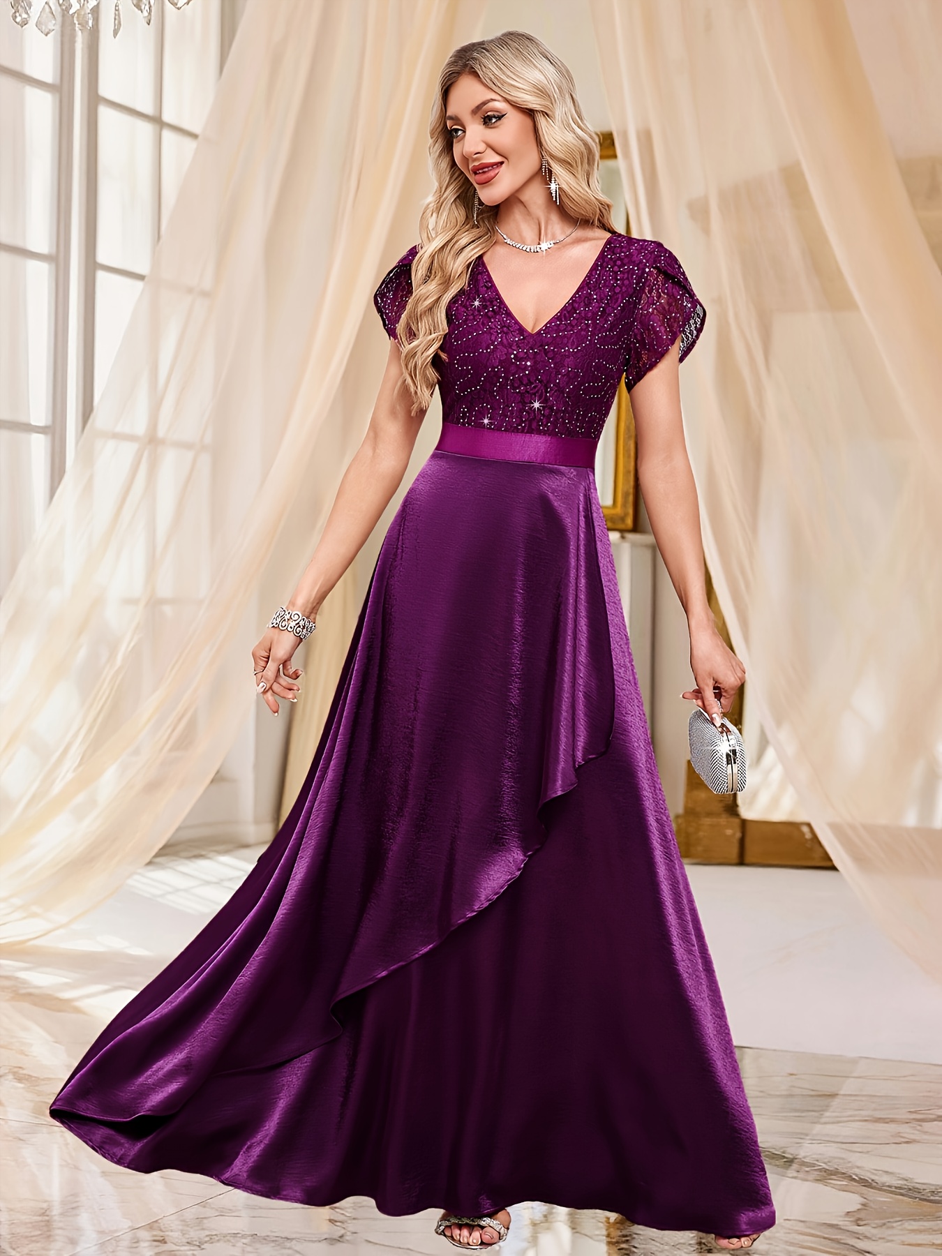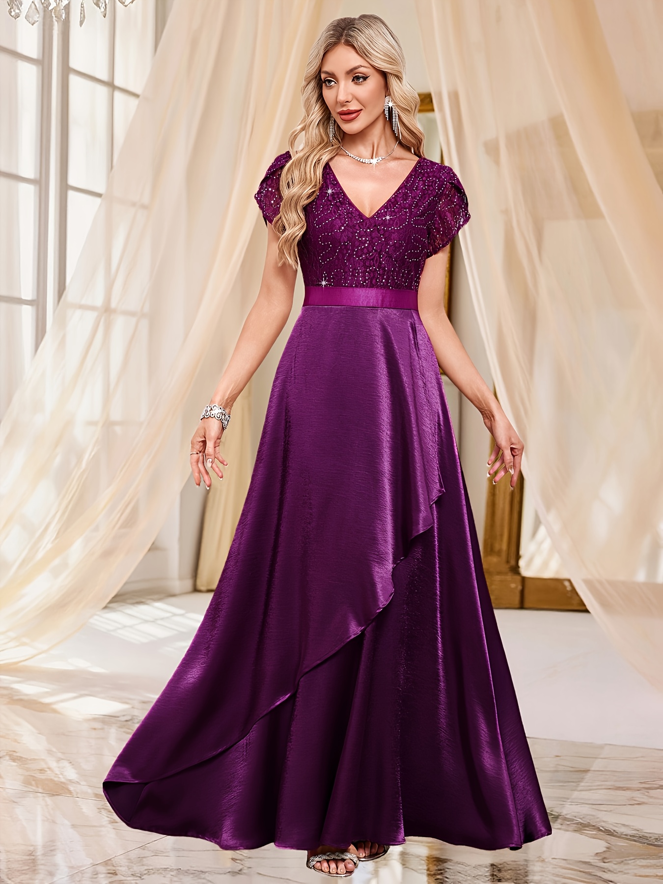 Elegant Purple Sequin Lace-Trimmed V-Neck Gown with Ruffle Sleeves and Flowing Skirt - Perfect for Formal Events, Formal Event Attire|Sequin Embellished Dress|Lace Trim Detail, Elegant Party Dress For Women, Elegant Dress For Women, Elegant Woman'S Dress